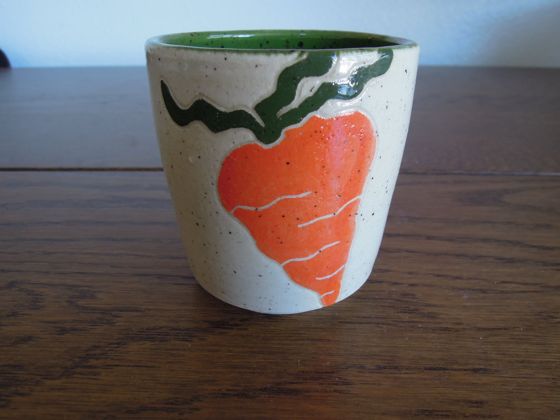 hefty carrots decorate outside of cup, with green speckled glaze on inside, and clear glaze outside.
