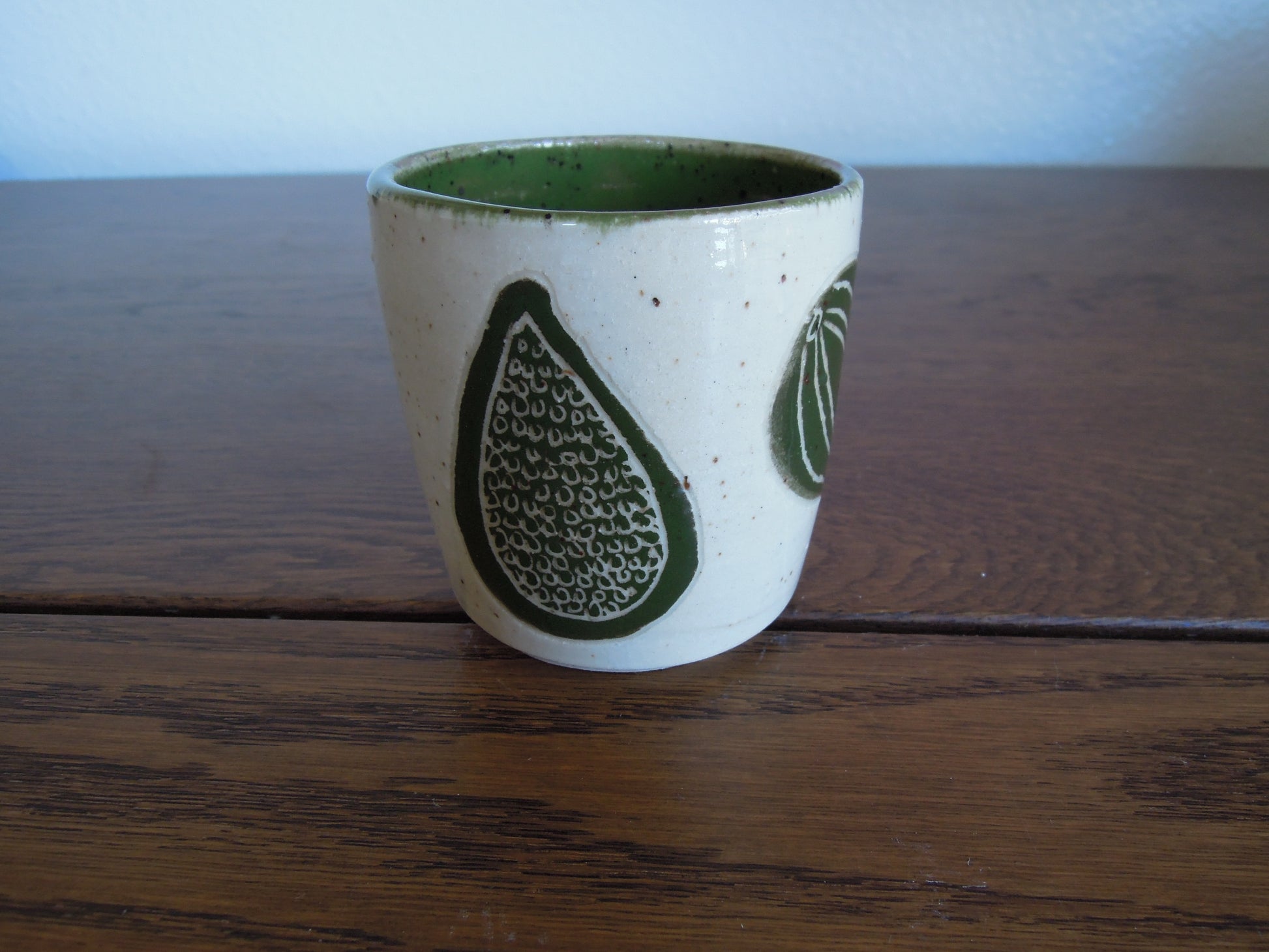 green plump figs decorate outside of cup, with green speckled glaze on inside, and clear glaze outside.