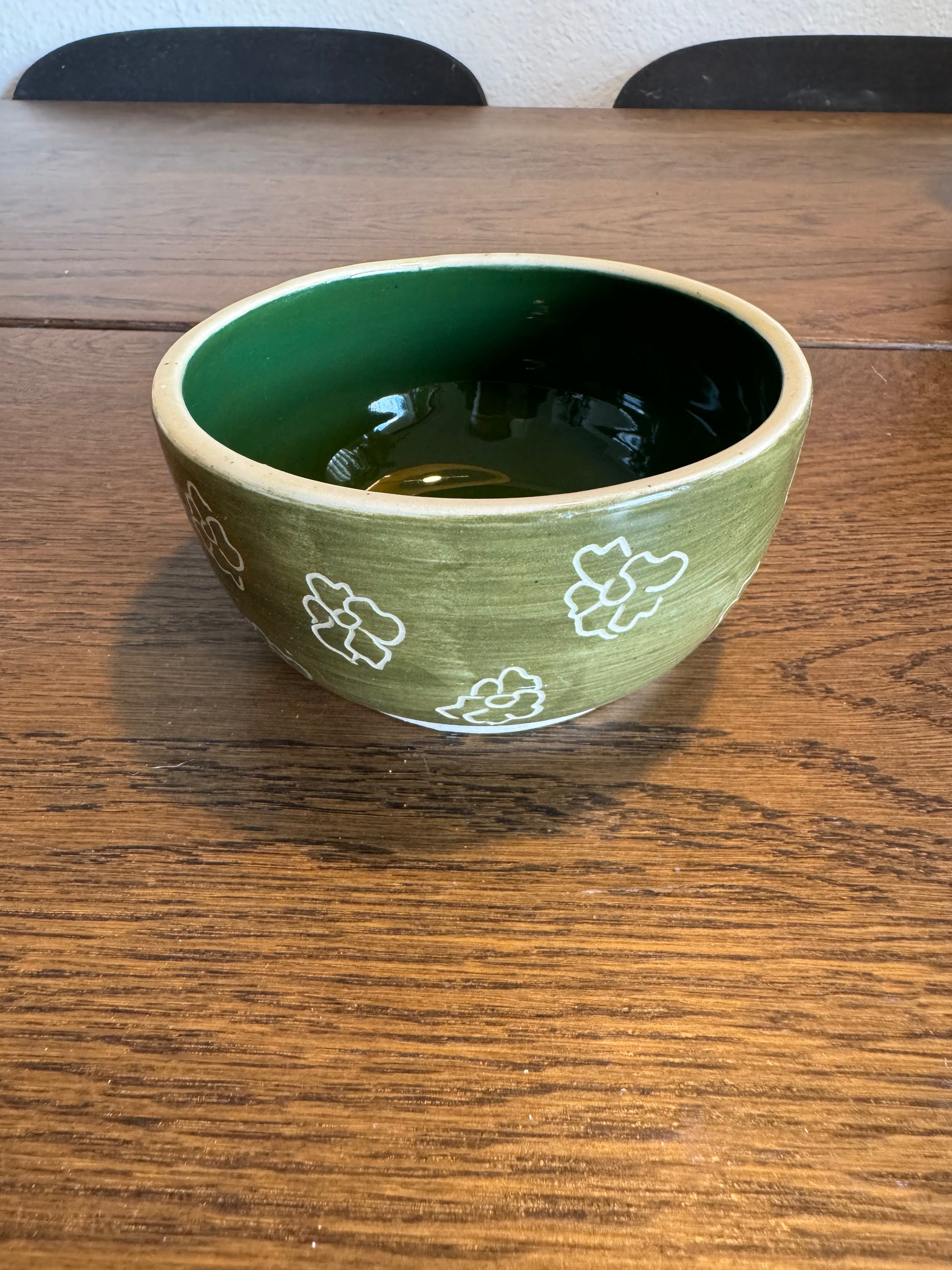 green bowl with flowers carved into bowl. dark green glaze on the inside.