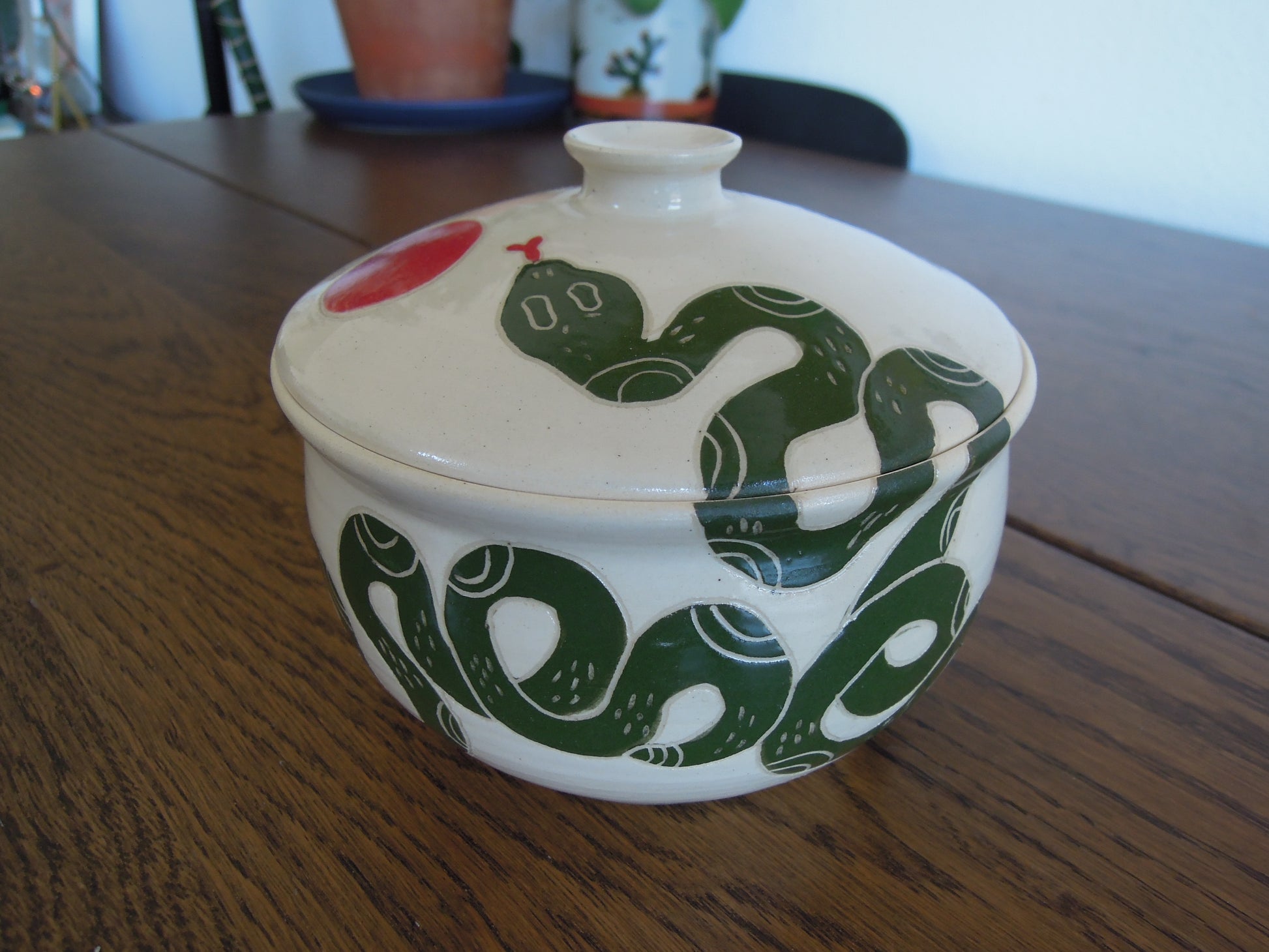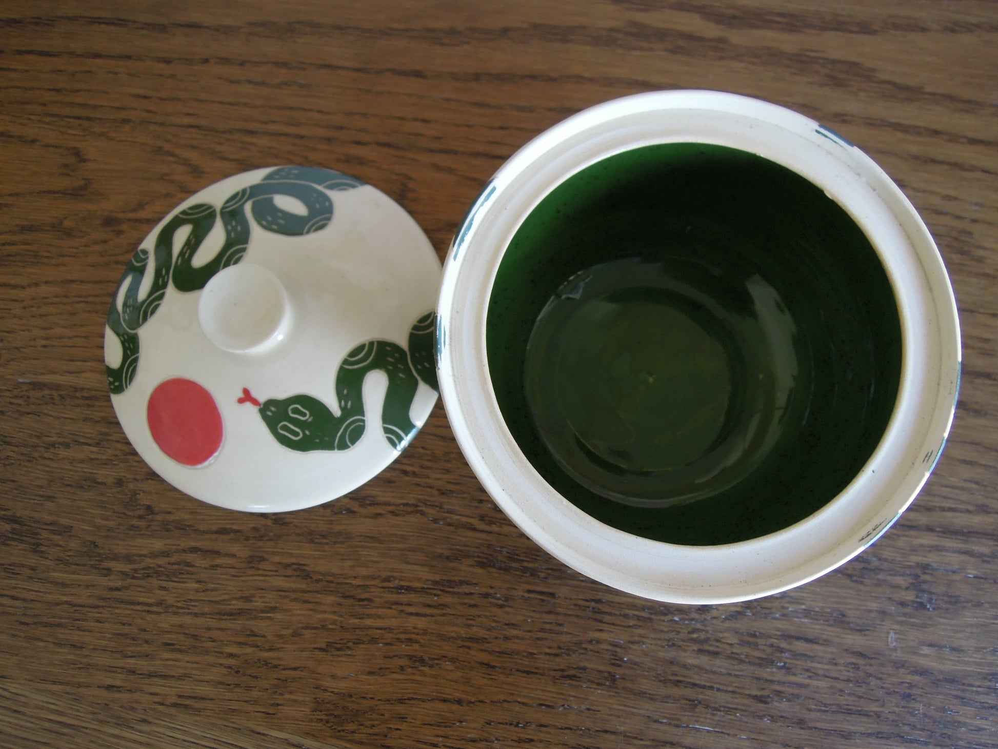 slitherin green snake wraps around outside of jar, clear glaze on outside, green speckled glaze on inside,