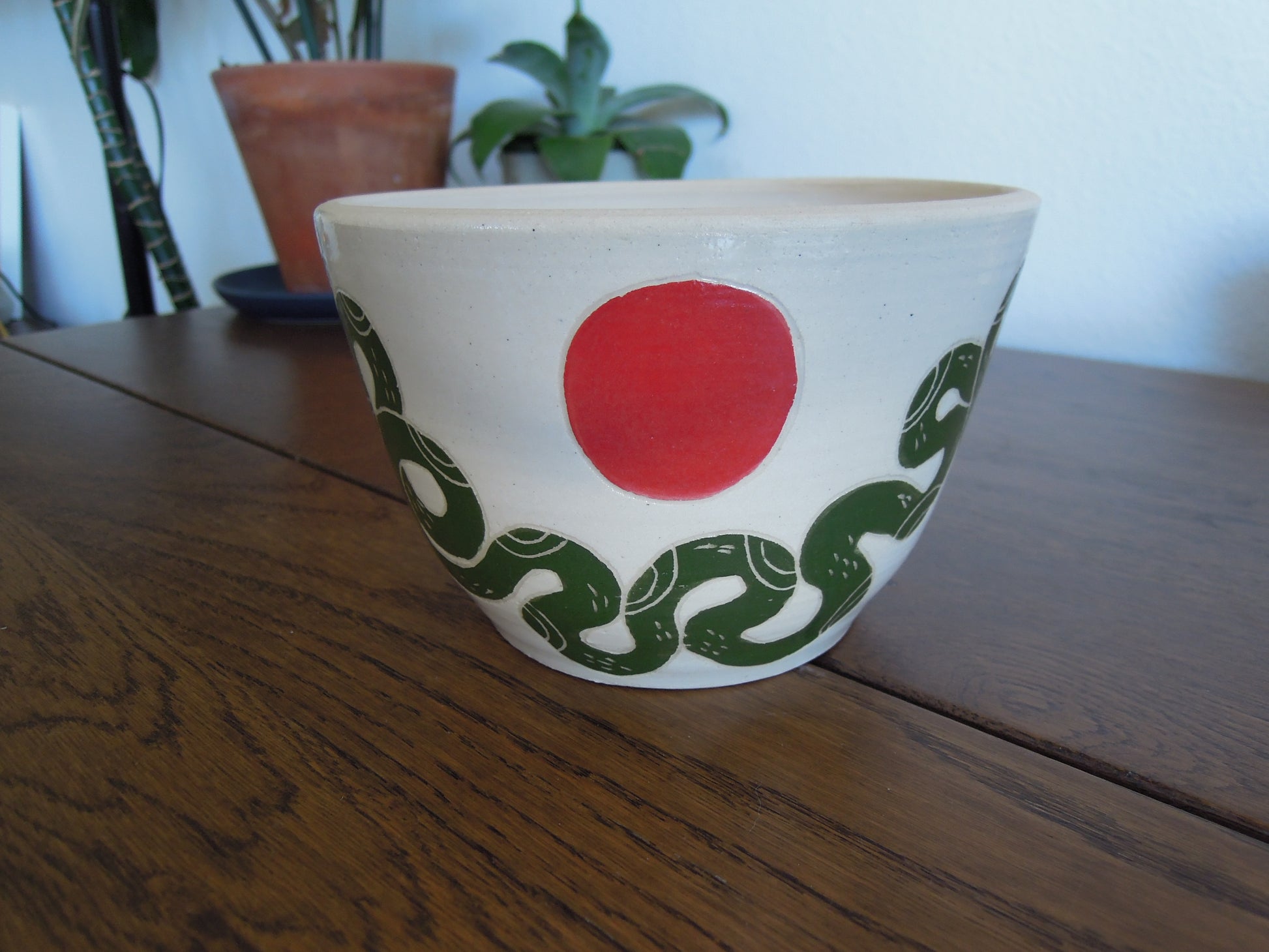 sneaky green snake decorates outside of planter, clear glaze on outside.